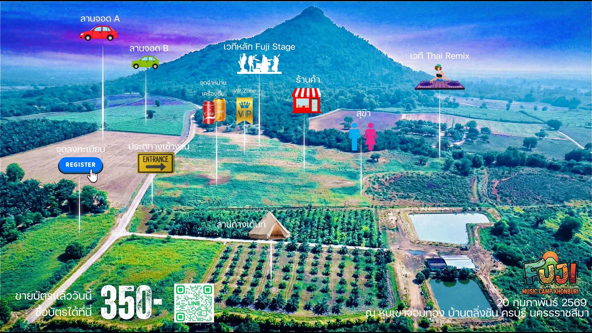 Fuji Music Camp 2026 is an outdoor music festival located in the mountain valley of Khon Buri, Nakhon Ratchasima. The event combines Thai indie live bands, DJs and camping atmosphere in a relaxed nature setting rather than a crowded city concert.